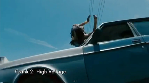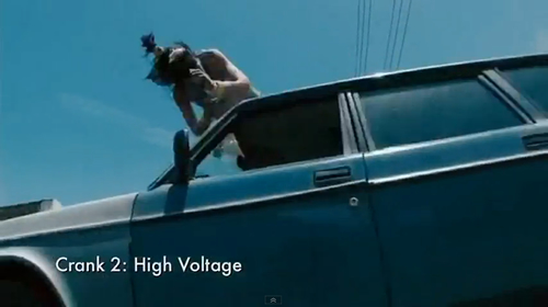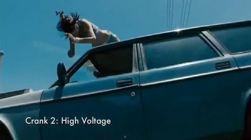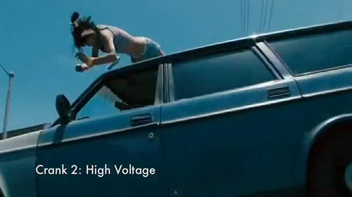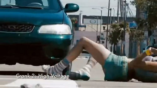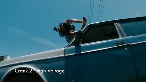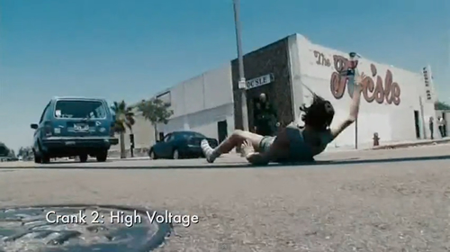 さらに別カットで車の後部から落下する様子。この写真から推測するに、走る車のルーフの上で後ろを向いて姉さんはスタンバイしていたと思われる。