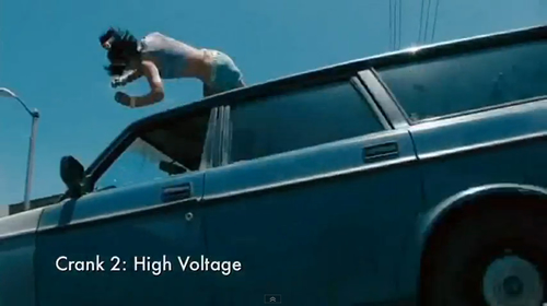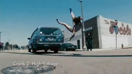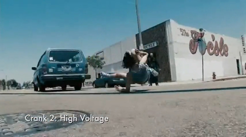 さらに別カットで車の後部から落下する様子。この写真から推測するに、走る車のルーフの上で後ろを向いて姉さんはスタンバイしていたと思われる。