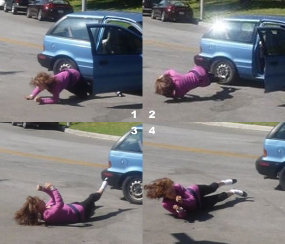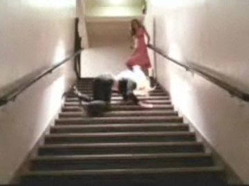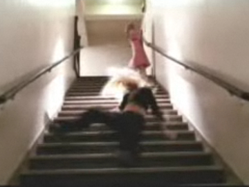 ハリウッドのスタントウーマンがおこなう階段落ちはまさに十人十色で、見るたびに「そんな落ち方するか!こりゃ一本とられた」と唸ってしまう。上の写真は、このブログで紹介した