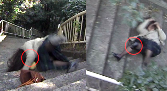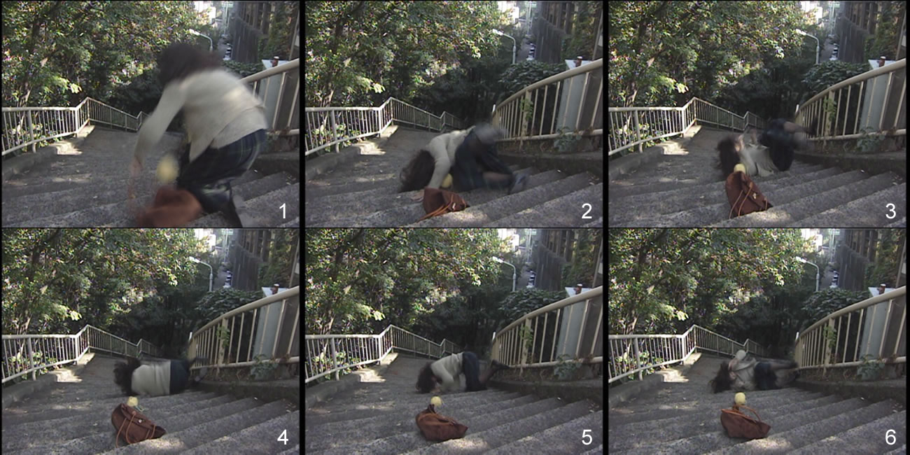 ファイトシーンなどは、スタントウーマン自身による“能動的”なアクションだが、「階段落ち」はボディスタントの中でも“受動的”なアクションと言える。重力や遠心力、反射といった外からのファクターによって、彼女たちの体には様々なスピードや回転が加わることになり、これにどう反応するかという部分に彼女たちの個性が表れる。